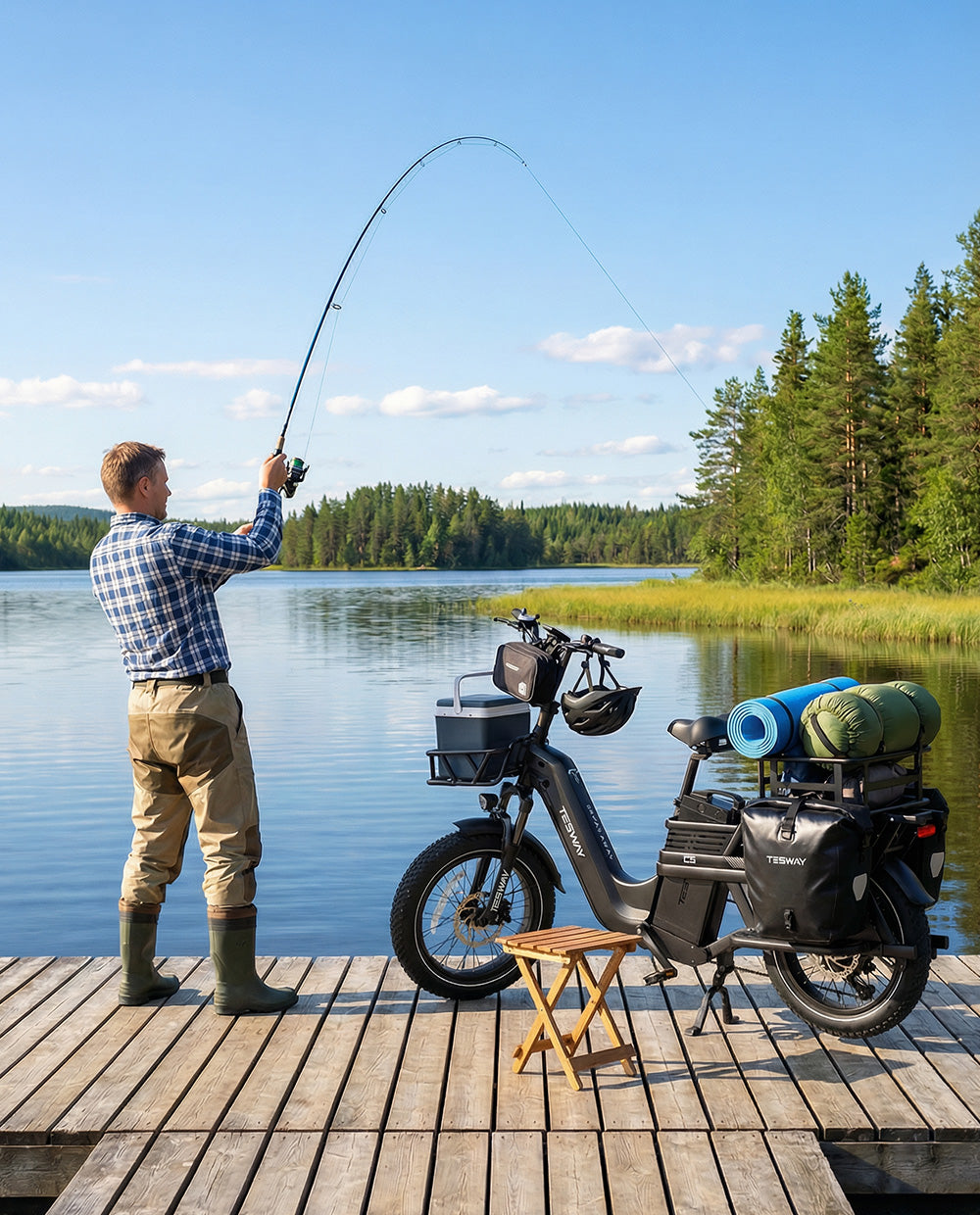 Built for outdoor fishing and heavy cargo use, the TESWAY C5 AWD Cargo E-Bike features a powerful dual-motor all-wheel-drive system and a massive 52V 60Ah battery, delivering exceptional torque and a maximum range of up to 200 miles.