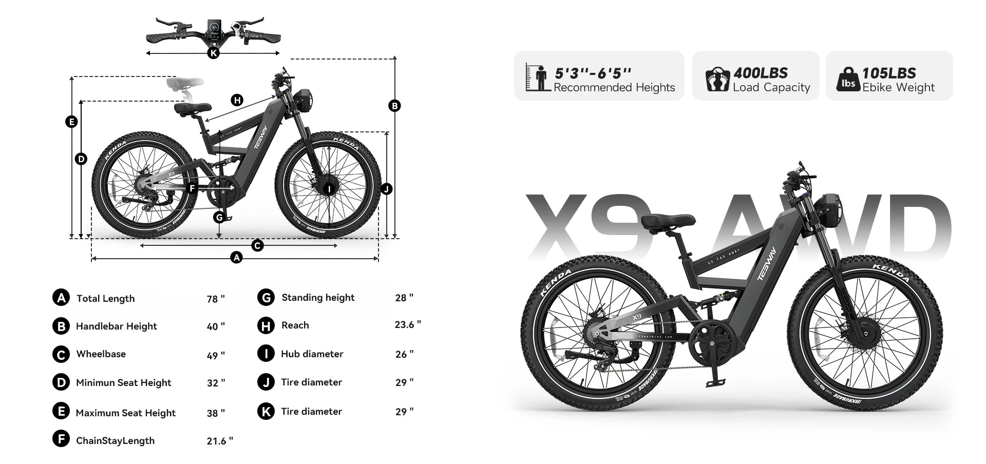 The Tesway X9 AWDโ€™s 26"ร—4.0" Kenda fat tires offer durability and enhanced safety, making for a stable, smooth ride on any surface.